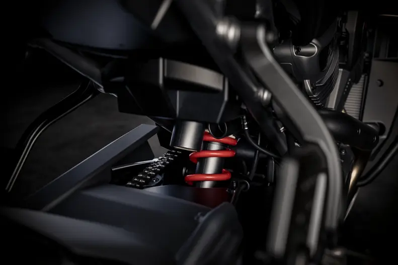 47mm inverted fork with electronically adjustable semi-active damping control. Aluminum fork triple clamps