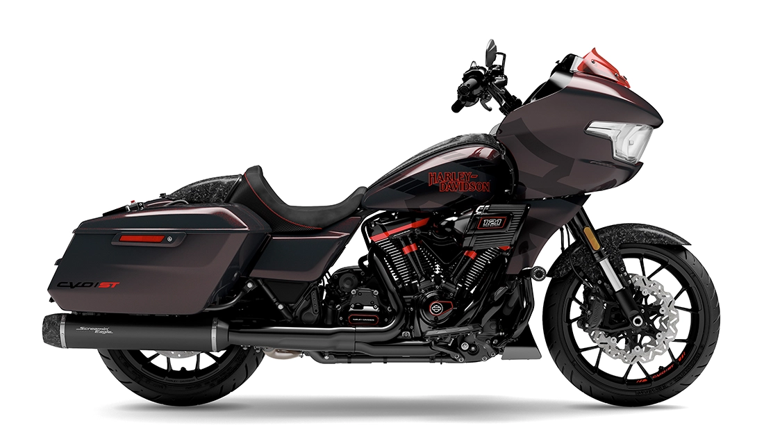 The 2026 CVO Road Glide ST is Harley-Davidson’s race-inspired bagger at its most ruthless. Its Milwaukee-Eight® 121 High Output motor delivers unbelievable power and performance, fed by a Heavy Breather intake and finished with titanium-capped mufflers. Forged carbon fibre details, tall risers with a factory moto-bar setup, remote-reservoir suspension, and specialised track modes give it the look and feel of a purpose-built weapon engineered to outpace everything around you.