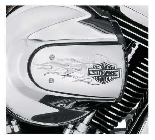 Harley-Davidson® Bar & Shield Flames Air Cleaner Trim, 61300221. Fits ’16-later Softail® (except FLSTFBS) and 14-later Touring and Trike models with Original Equipment air cleaner cover. Does not fit CVO™ models. Ever since they began emerging on gas tanks a few decades ago, flames have been a symbol of custom styling. Harley-Davidson® continues the tradition with these easy to install air cleaner inserts. These highly detailed chrome inserts reflect your burning desire to ride. Chrome flames surrounding the Harley-Davidson® Bar & Shield graphic. Includes chrome-plated stainless steel mounting hardware. 1 year limited warranty. 61300221