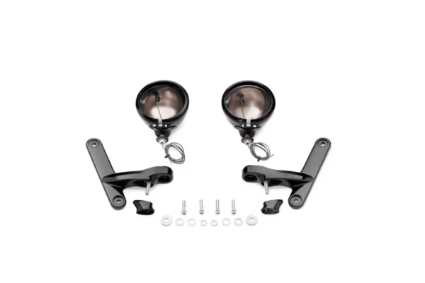 Shaped by the wind, this Auxiliary Lighting Kit follows the contours of the triple tree and headlamp shell for a custom look. The elegant cantilever brackets serve as stylized mounting points for the passing lamp and turn signal housings and eliminate the cross brace and flat side supports of traditional auxiliary lamps. Fits ’97-’13 Electra Glide® and ’94-’13 Road King® models. Does not fit Street Glide® models. Road King models equipped with windshield require separate purchase of Hardware Kit P/N 69235-04. CVO Road King models require the purchase of additional components. For installation on FLHRS models that do not presently have a windshield, but wish to install a windshield, the additional purchase of Hardware Kit P/N 69234-04 is required. Kit includes passing lamp housings, mounting brackets and hardware. Installation reuses Original Equipment sealed beam lamps and retaining rings. Bullet Turn Signal Kits sold separately.