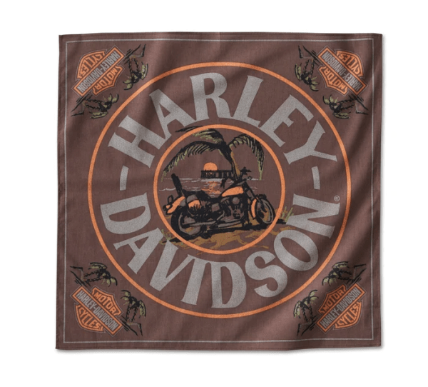 1980s rally style is revamped on this Limited Edition. Our Daytona Bandana is cut from breathable cotton and traditionally sized for wearing. Bandanas are a must-have for road trips—they protect your scalp from the sun, soak up sweat, and provide a cushion under your helmet while you ride. Finished with a scenic backdrop and H-D graphics inspired by our 1980s Fat Boy tank art. Snag yours before they’re gone.