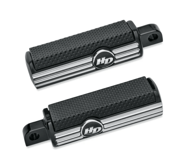 • Custom aluminum footpegs feature a pattern of deep lateral grooves and a stylized H-D™ logo for a modern sleek look