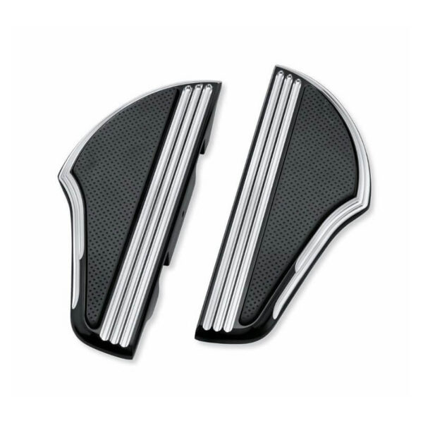 Show your complete disregard for the rules. Defined by sweeping curves, this Passenger Footboard Kit features a rich tuxedo black finish that is the perfect complement to your sinister ride. The design incorporates a field of textured, black, perforated rubber surrounded by deep grooves with deep lateral lines on the inside. The complete Defiance Collection sets a new rebellious direction in customizing. These extended length, sweeping shark-fin footboards are shaped to maintain a long and lean appearance, offering plenty of options for foot repositioning while on the bike.