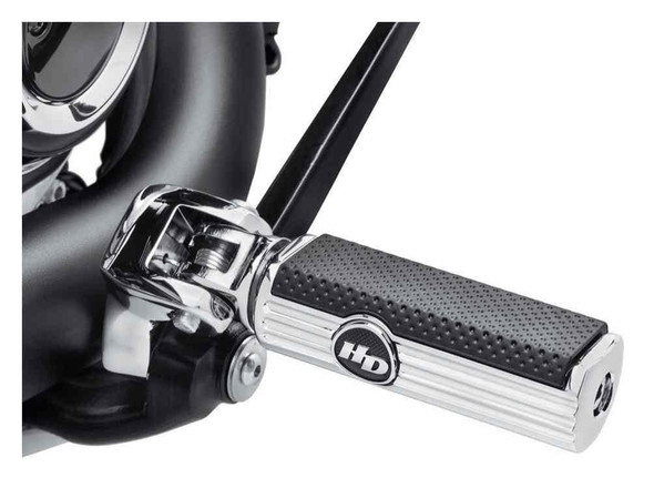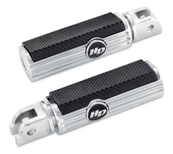 Harley-Davidson® Defiance Rider Footpegs – Chrome, 50500803. Fits rider position on ’18-later FXBB and FXLR models. Dare to be bold. Dressed in luxurious chrome, this complete hand and foot control assortment raises the customization bar. Defined by sweeping curves and accented with deep longitudinal lines and a contemporary H-D logo. Chrome finish. Features rich textured black rubber traction surfaces set in a field of mirror chrome. Includes a stylized H-D logo for a modern sleek look. 1 year limited warranty. 50500803