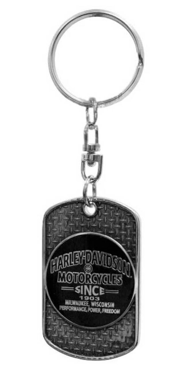 Harley-Davidson¨ Winged Skull distressed Dog Tag. Can be either a necklace or a key chain. Necklace chain in 11” long. Size of dog tag is 2” x 1.5”. Made of solid, heavy-duty metal.