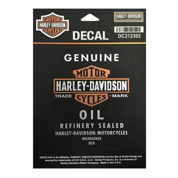 Harley-Davidson¨ Genuine Oil Decal. Classic Genuine Oil Bar & Shield graphic. Awesome matte black background with a metallic graphic. Small size decal. Two decals per sheet, includes the Bar & Shield logo at top.