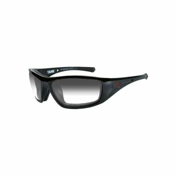 Harley-Davidson® Men’s Tank Climate Control sunglasses, HDTAN08. Features Bar & Shield logo on both temples. Copper lens and gloss black frames. Includes: Semi-hard black zippered case, leash cord and cleaning cloth. Removable gasket included.