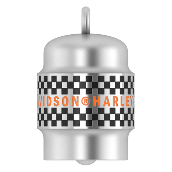 Harley-Davidson® Checkered Ride Bell, HRB118. Bold engraved Harley-Davidson® text with a racing checkered design. Made from durable sterling silver. Includes ring for hanging.