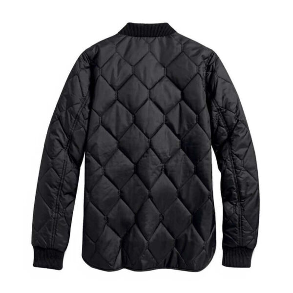 Harley-Davidson® Women’s Reversible Quilted Jacket, 98404-20VW. The black quilted side flips to a contrasting shade to expand your mix-and-match options. Quilted with lightweight fill for warmth. Made from 100% black nylon taffeta reverses to 100% polyester taffeta. Snap front. Snap hand-warmer pockets and single chest pocket on black side. Single chest pocket on reverse side. Reversible design for versatility. Rib-knit collar and cuffs. Embroidered patches. Woven label. 98404-20VW