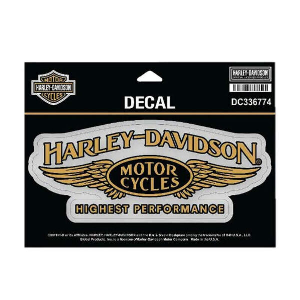 Harley-Davidson® Highest Performance Decal, DC336774. Winged Motorcycles graphic with famous Harley-Davidson® script. Large size decal. Two decals per sheet, includes the Bar & Shield logo at top. Size: 7″ W x 2.8125″ H. Proudly Made in the USA. DC336774