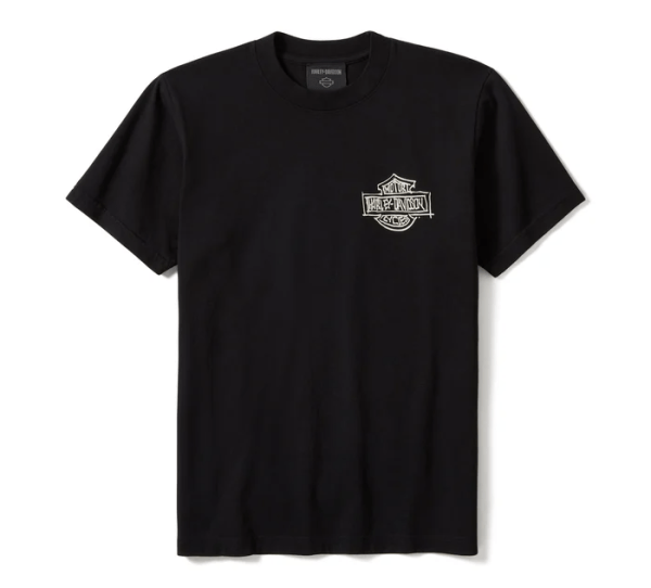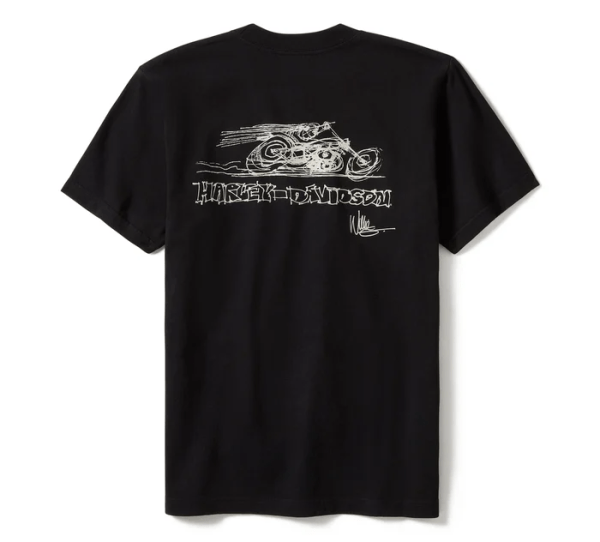 Legendary style meets the rush of the open road on our In The Wind Rider Sketch Art Short Sleeve Tee. Its durable cotton jersey build delivers a relaxed fit that’s enzyme washed for a well-worn vibe. Finished with an original Willie G design that captures the essence of Harley-Davidson die-hards. Part of the Willie G Sketch Collection of authentically made in USA garments that feature hand-drawn and signed artwork by our iconic designer, Willie G. Davidson
