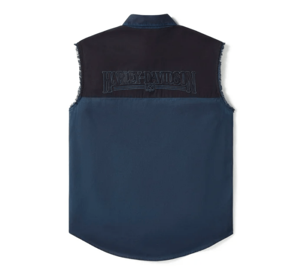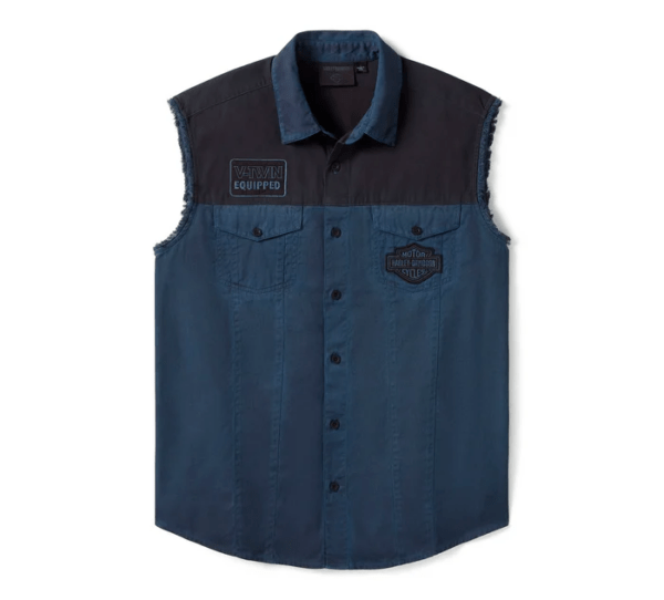 H-D style takes a nostalgic detour on the limited-issue Iron Bond II Blowout. Crafted from a rugged yet breathable cut of cotton twill, this men’s sleeveless button down shirt features a hidden snap-down collar that won’t flap around under riding gear. Finished with classic H-D patches on front and graphics on back that mimic our 1980s tank art. Order now while supplies last.