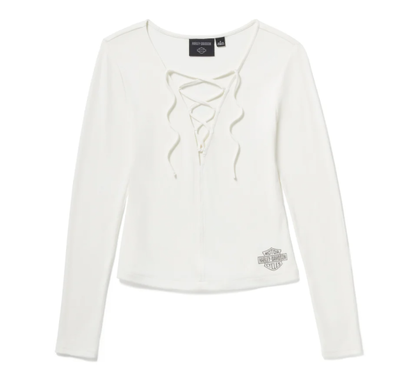 Shape-flattering style gets a hit of Harley pride in our Lace Up Long Sleeve Top. It’s crafted for breathable, longwearing comfort from a cotton/modal blend with spandex for added stretch and ribbed for a textured look. This women’s top in a shorter, fitted silhouette features a deep V-neckline with a lace-up drawcord. Minimally branded near the hem in metallic print for a versatile look that pairs well with whatever’s in your wardrobe.