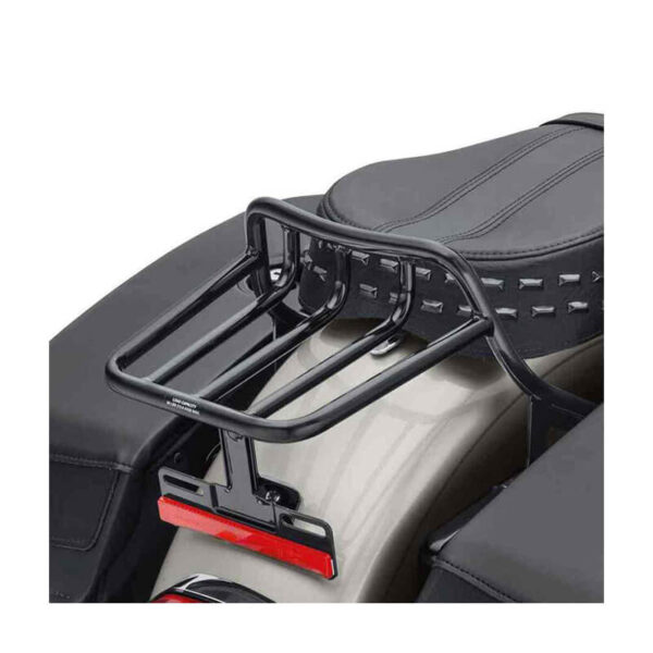 Harley-Davidson¨ HoldFast Two-Up Luggage Rack – Gloss Black, 50300133. Fits ’18-later FLDE, FLHC, FLHCS, FLSL and FXBB models equipped with two-up seats. Installation requires separate purchase of model-specific Docking Hardware Kit. FLHC and FLHCS models with oversize international registration plates may interfere with Luggage Rack and may requires separate purchase of License Plate Relocation Kit P/N 67900472. Gloss Black Finish. Rack simply slips into position on the docking points. Fingertip latches are clicked into position for a positive lock. Leading edge of the rack features a flip design that keeps luggage from sliding forward. Provides a convenient tie-down attachment point. Low-profile styling defines the look of this Two-Up Luggage Rack. Designed to be installed without a sissy bar, this rack is ideal for carrying everything you need on your daily commute. These HoldFastª Luggage Racks feature an exclusive latch system that permits the rack to be installed or removed in seconds, adding versatility to your ride.