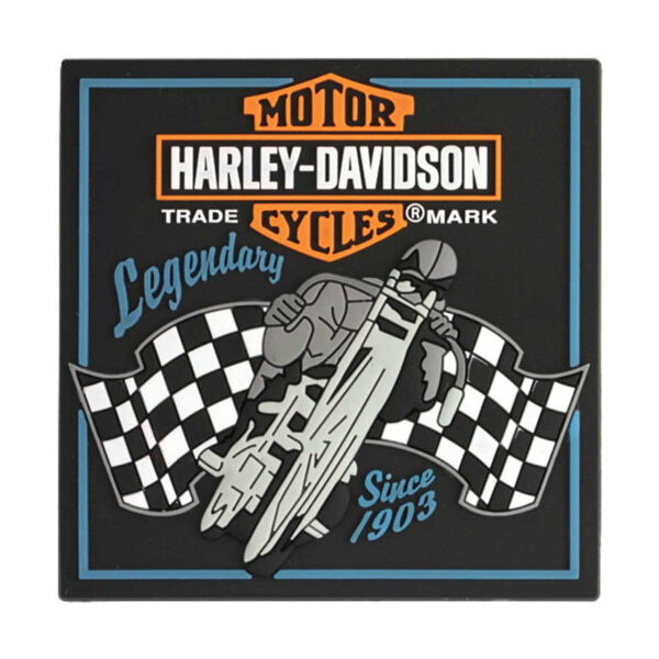 Harley-Davidson® Legendary Racer magnet. Features a racing flag Bar & Shield graphic. Tile magnet, 2.5” x 2.5”. Rubber front with strong magnet backing.