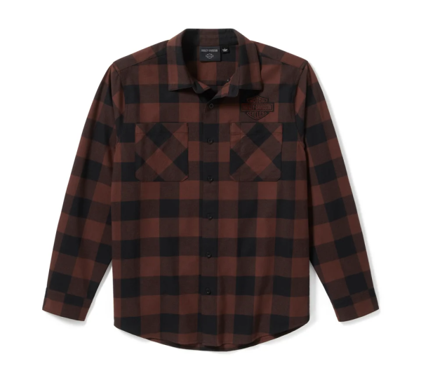Cozy, classic style is all yours in the Bar & Shield Buffalo Check Flannel. It’s made for longwearing comfort from brushed cotton twill that’s washed for softness. This men’s long sleeve button down shirt features a shirttail hem that looks great tucked in or out, a handy pen stall on the left chest pocket, and a hidden snap-down collar that won’t flap around under riding gear. It’s an ideal pick to wear as is, or open over your favorite H-D® tee. The bold buffalo check pattern complements the patches of our most notable logo on the front and back.