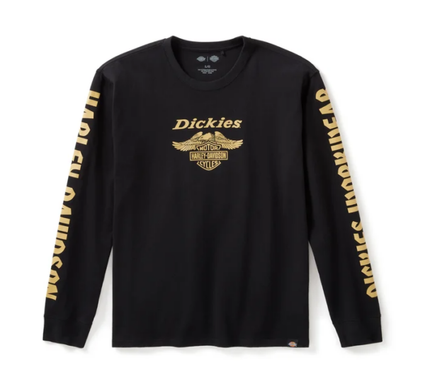 Move-with-you comfort honors legendary style on the Dickies® x H-D® Heavyweight Long Sleeve Eagle Tee. Ruggedly made from breathable cotton jersey in a relaxed fit. Features taped neck and shoulder seams, plus a rib-knit neckline and cuffs to help keep its shape. This men’s long sleeve t-shirt is finished with signature artwork on the front and riding down the sleeves. Part of the Dickies® x H-D® Collaboration—special-edition apparel that merges iconic workwear with iconic motorcycle culture.