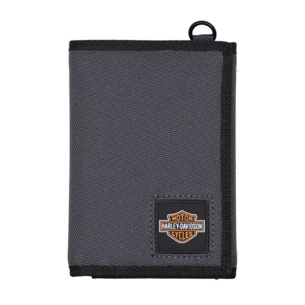 Men’s Full Speed Tri-Fold Wallet, HDMWA11760-GRY. Made of high-quality gray polyester with contrasting black nylon trim. Features a rubberized Bar & Shield logo. Interior features: 3 credit card slots, zippered coin pocket, mesh ID window and cash slot. Matte black finish on zippers and biker chain ring. Secure velcro closure. RFID Protection, blocks hackers from reading your information. Size: 3.25″ x 4.5″. Perfect size to fit in the pocket of your jacket or jeans. HDMWA11760-GRY