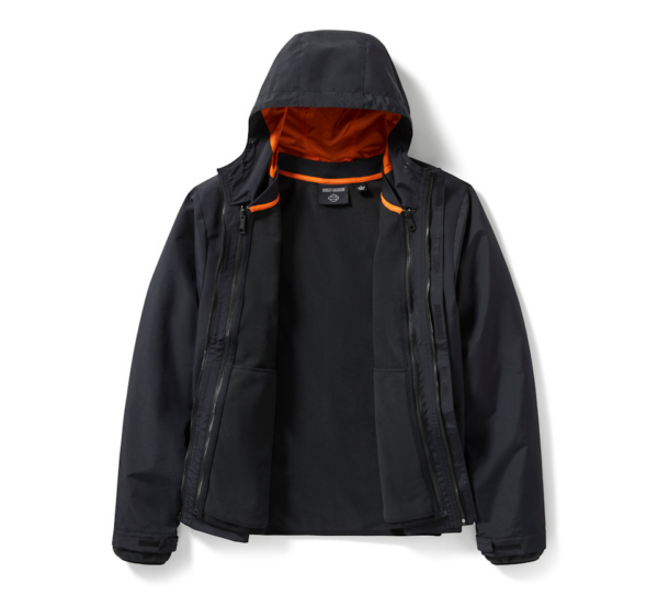 Be ready for whatever Mother Nature throws your way in our H-D® TECH 3-IN-1 Jacket. It’s wisely built with a removable waterproof outer jacket and a removable windproof inner jacket. This men’s outerwear is made from durable nylon ripstop and bonded polyester. It features a combo of Velcro® and elastic closures, waterproof seams, and a toggle-cord hood to keep you comfortable in challenging weather conditions. It also provides ample pocket space for securing essentials. The contrast hood lining complements the graphics for a more contemporary H-D look. Wear the inner jacket alone, the outer jacket alone, or combine them for maximum warmth and coverage.
