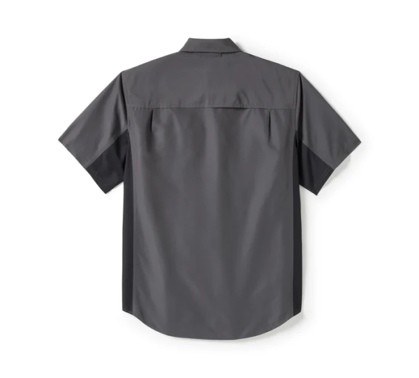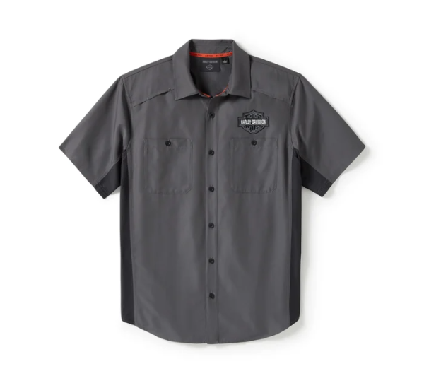 Staying cool goes both ways in our H-D® TECH Colorblock Shirt. Its polyester ripstop and mesh build wicks moisture and dries quickly, while its shirttail hem looks great tucked in or out. This men’s short sleeve button down features air-loving vents to help manage any possible sweat situations, and a hidden snap-down collar that won’t flap around under riding gear. Its contrasting style stays clean on back and gets a hit of embroidered graphics on front for a contemporary H-D look.