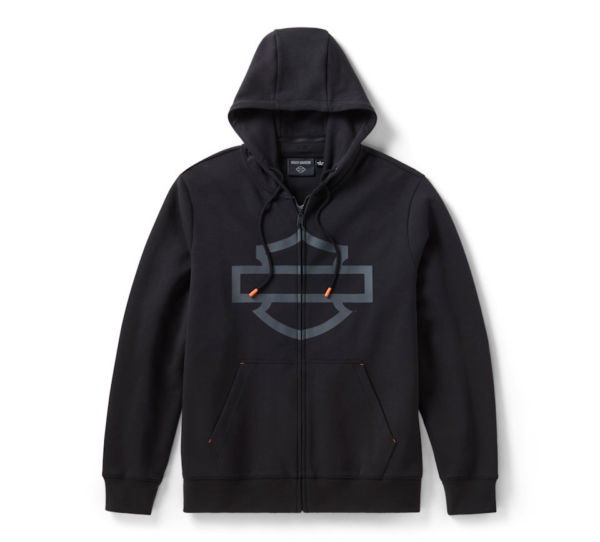 Contemporary, practical moto style is all yours in our H-D® TECH Gaiter Zip Hoodie. It’s made durable yet comfortable from a heavyweight cotton/polyester interlock in a relaxed fit with underarm vents to keep you cooler. This zip-front men’s hoodie also features a built-in neck gaiter to wear over your mouth and nose to block wind or repel dust and bugs, plus its hood drawstrings tuck away while you ride. This sensible layer under your riding gear is finished with our graphics on the front and hem, plus a pop of our iconic orange for a more modern H-D look.