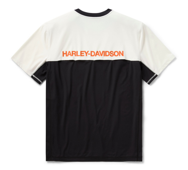 Level up your t-shirt situation with this pick. Made from a polyester/spandex jersey blend, our H-D® TECH Color Block Vented Tee delivers stay-cool comfort with mesh underarms, side panels, and back panel venting. It also delivers an elevated look with its colorblock styling and high-density print of our contemporary branding on both sides.
