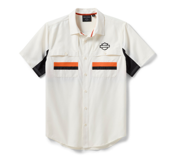 Cool goes both ways in our H-D® TECH Vented Short Sleeve Shirt. It keeps you cool with its polyester ripstop and mesh build that wicks moisture and dries quickly. It looks cool with its contrasting style, top-applied striping, and graphics that deliver a bold, modern H-D look. This men’s short sleeve button down features a shirttail hem that looks great tucked in or out, and a hidden snap-down collar that doesn’t flap around under riding gear.