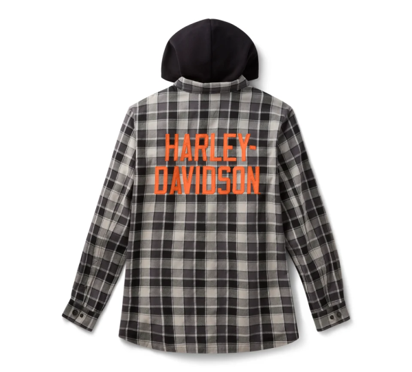 Casual style gets an H-D upgrade on our Hooded Plaid Long Sleeve Shirt. It’s made breathable yet durable from cotton twill that’s washed for softness and a well-worn feel. This men’s snap front shirt features a soft jersey drawstring hood, plus a hidden snap-down collar that stays put under riding gear. The front stays clean with a hit from our branded woven label, while the back shows off a vibrant jersey appliqué.