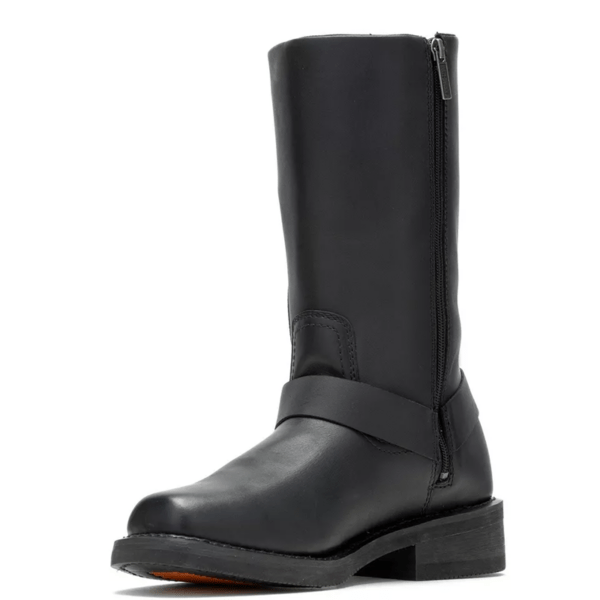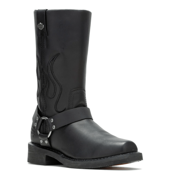 Harley-Davidson Men’s Hustin Black Motorcycle Harness Boots, D96310. The classic Hustin harness boot has been elevated with subtle flame embroidery detail. Featuring full-grain leather and full-length YKK locking inside zippers for a quick and secure fit, this is a style ready for any destination. A full-length mesh lining means total comfort no matter where you go. The squared-off toe gives way to the classic harness straps, all attached to the famous harness O’Ring. A metal Bar & Shield badge adorns the pull-on strap. A debossed logo is also found on the heel’s counter. The street-side rubber outsole sports an inlayed orange Bar & Shield logo at the instep. The foot and heel tread elements are in Harley orange, was well. The boot’s styling has a mild western flair, exuding just the right attitude for Harley riders. The boot’s sole, insole and upper are bound using resoleable Goodyear Welt construction processes, the most labor intensive and durable construction method available. This Hustin harness boot is streamlined, simple, clean, and ready for business. Shaft height: 11″; Heel height: 1.5″. Manufacturer Part Number D96310.