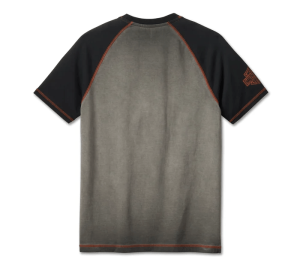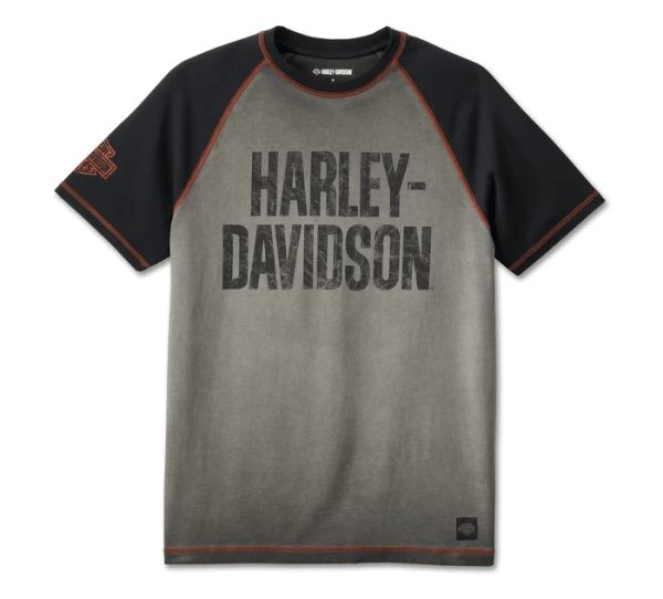 Refresh your t-shirt stash with this throwback-meets-modern pick. Cut from heavyweight cotton jersey, our Iron Bar Raglan Tee delivers a relaxed fit that’s cold pigment dyed for a well-worn look and feel. Contrast raglan sleeves, coverstitching and distressed graphics give this men’s short sleeve tee a timeless look that’s 100% Harley-Davidson.