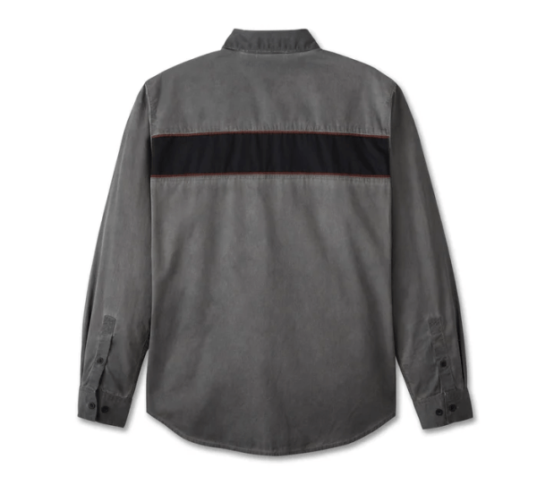 From workdays to weekends, your look is always on point in the Iron Bond Long Sleeve Shirt. Made from rugged cotton twill that’s cold pigment dyed for a worn-in vibe, this men’s button down delivers a relaxed fit. Features chest piecing and piping for an elevated look, plus a hidden snap-down collar that stays put under riding gear. Finished with a hit of our most iconic Bar & Shield on front in distressed print.