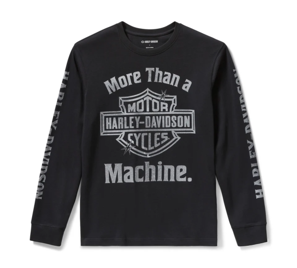 Keep your moto style loud and proud in our More Than a Machine Long Sleeve Tee. It’s cut from breathable, all-cotton midweight jersey that’s washed for a soft, well-worn feel. The striking graphics parked on front and riding down the sleeves have a distinctive metallic look (zoon in to see). Know the history—the “More than a machine” slogan here gained prominence after our buyback from AMF in 1981.