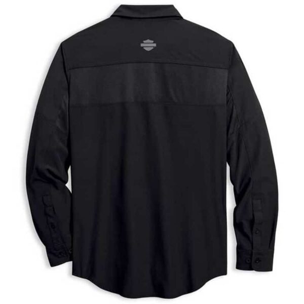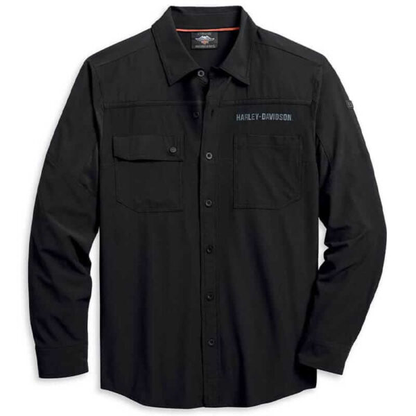 Harley-Davidson® Men’s Performance Fast Dry Vented Shirt – Black, 96016-20VM. Log miles and stay in peak form in the long sleeve Performance Fast Dry Vented Shirt. It starts with feather-light wicking fabric that swipes moisture away from skin to help keep you dry and comfortable. Mesh underarms and a vented back panel help promote air circulation. Tonal low-key graphics advance a streamlined, sporty look on this men’s wicking shirt. Made of 90% polyester, 10% spandex twill upper sleeves and front/back yokes. 92% polyester, 8% spandex ripstop body. 100% polyester mesh underarm and back panels. Fast drying wicking fabric and venting for breathability and cooling effect. Snap-down collar. Button front, cuffs, and chest pockets with tire-gauge slot. High-density graphics. 96016-20VM
