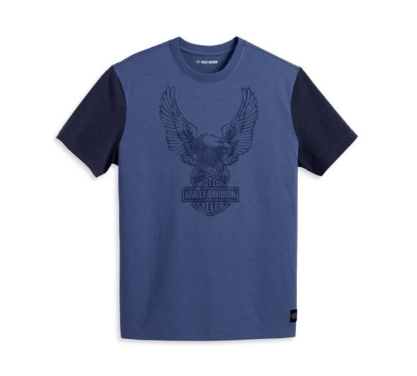 In the Limited Edition Road Captain Colorblock Tee, freedom has never looked so good. This cotton and polyester jersey mens t-shirt pairs all-day comfort with contrasting sleeves for sporty styling. We print our soaring Eagle on the front to rep your H-D® pride and finish with a woven label at the hem.