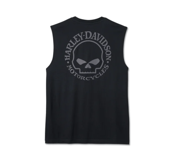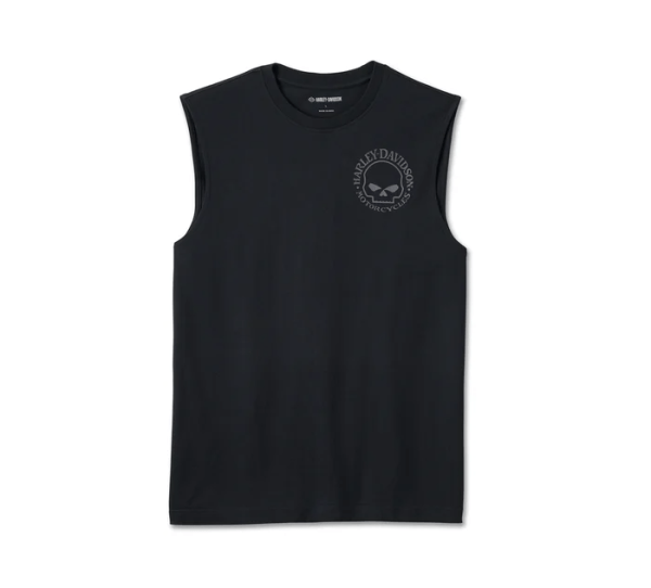 Our Willie G Skull Muscle Tee is an ideal pack-long shirt for rides and rallies. It sleeveless style is crafted from a breathable midweight cut of cotton jersey with a rib-knit neckline to keep its shape. Finished with the Willie G. Davidson Skull brooding on front and boasting on back. Know the history—Willie G originally created the Skull for the 2000 Daytona Bike Week, and it’s been a rider favorite ever since.
