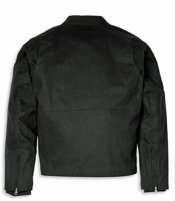Construction features include a two-way front zip-closure with hidden-snap placket, pre-curved sleeves with cuff zippers over rib-knit cuffs & action back