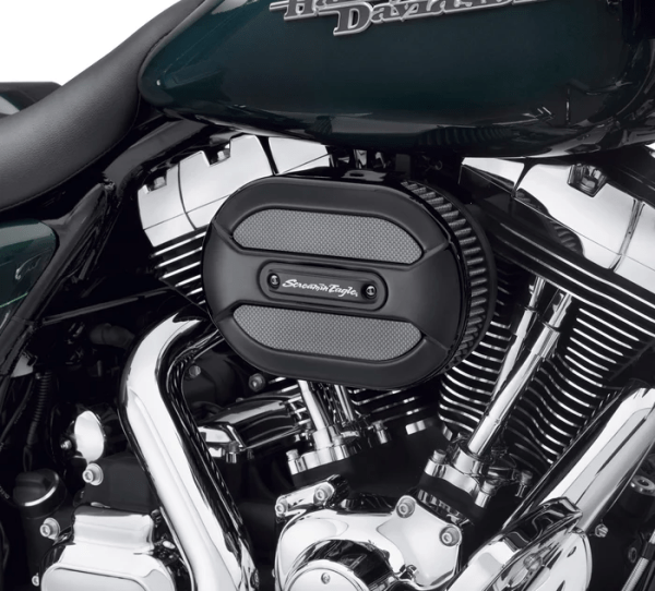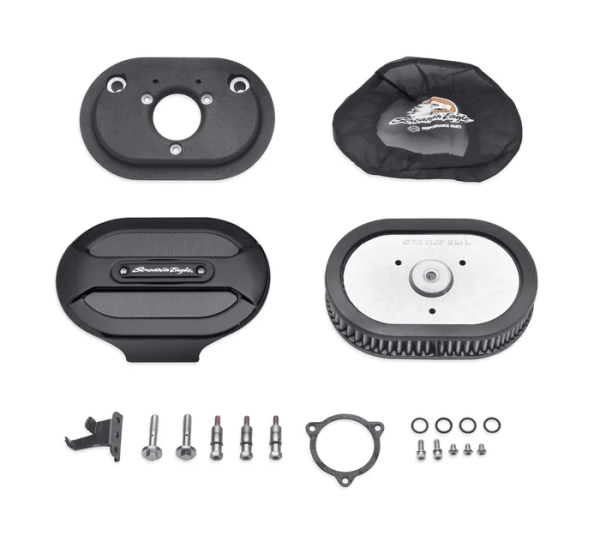 • Complete kit includes low-profile air cleaner cover, high-flow filter element, back plate, diamond-cut Screamin’ Eagle® medallion, protective rain sock, and all required installation hardware