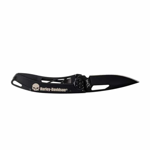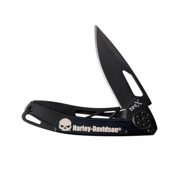 This TecX® Dinero folding knife is part of the Harley-Davidson® family. It is a high-quality knife that has a stylish modern design engineered from high-grade materials for lasting durability. Designed and built for customers looking for the ultimate utility knife, this knife has a wide range of applications such as camping, field dressing, or everyday tasks. This pattern features a frame lock mechanism for convenient one-hand opening. The frame lock is located on the side of the knife and is a channelled lock arm that moves inward to lock against the blade when the knife is opened. Pushing outward releases the blade from the locked position so that the user can close the blade. This utility knife features a Drop Point blade and stainless steel handle with a black hard coat. The Drop Point blade on this durable folding knife is commonly used for tasks such as cutting, skinning, and carving. The Drop Point blade has a thicker and stronger spine near the tip that allows for more control when cutting. Additionally, the pocket Clip allows for easy access. Constructed with 440 stainless steel, this knife has a higher grade of cutlery steel, with more carbon, allowing for better edge retention, excellent rust resistance, and ease of re-sharpening. Comes conveniently packaged in a box. This TecX knife comes with a limited lifetime warranty that protects against defects in manufacturing and materials. Manufactured in China to W.R. Case & Sons Cutlery quality standards.