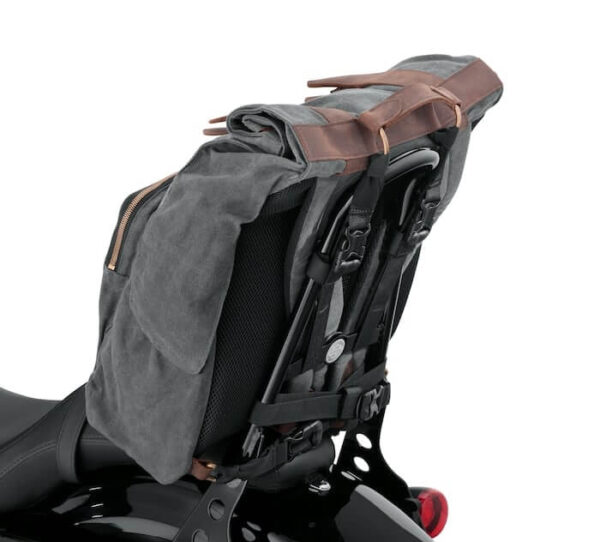 This durable and practical Waxed Canvas Backpack mounts securely to any model equipped with a sissy bar upright – or just throw it on your back and mount up.