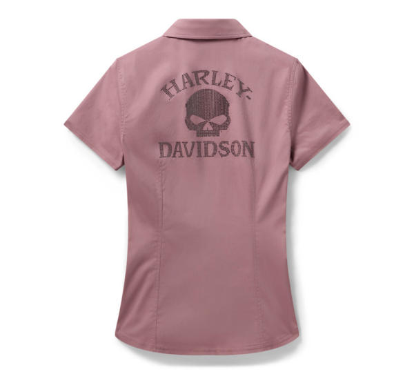 Shape-flattering style gets a glimmering kiss on the Willie G™ Bling Garage Shirt. Its fitted silhouette is crafted from a rugged twill blend that’s peached for softness with a hit of spandex for move-with-you stretch. This women’s zip front short sleeve shirt features a deep V-neckline, bust darts, and princess seams, plus a hidden snap-down collar that stays put under your riding gear. Finished with stunning rhinestone graphics on both sides. Know the history—though the Skull spotlighted here on back is one of his most popular creations, Willie G. Davidson also designed several motorcycles, including the 1971 FX Super Glide® model and the 1977 FXS Low Rider® model.