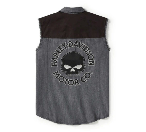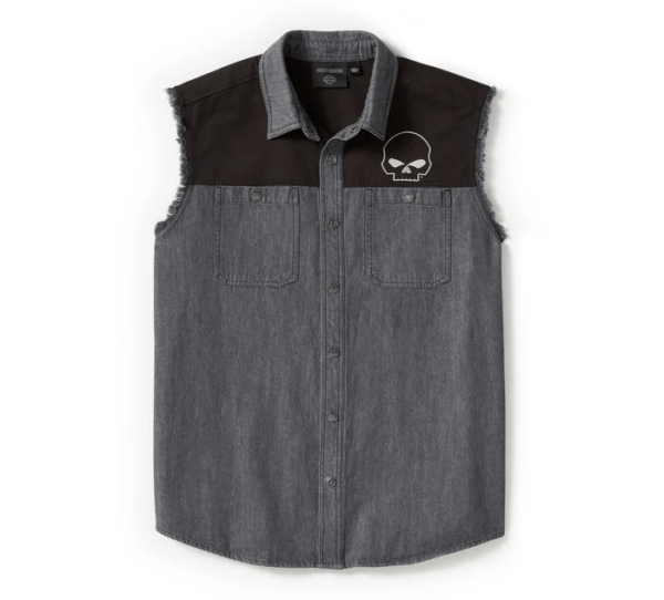 Classic biker style shares a lane with legendary artistry on our Willie G™ Skull Blowout. Made rugged from cotton heavyweight twill that’s stone washed for softness and a well-worn vibe. Features snap-closed chest pockets and a hidden snap-down collar that won’t flap around under riding gear. Its contrast fabric piecing complements the fearless Willie G Skull embroidered graphics. Though the Skull is one of his most popular creations, Willie G. Davidson also designed several motorcycles, including the 1971 FX Super Glide® and the 1977 FXS Low Rider®.