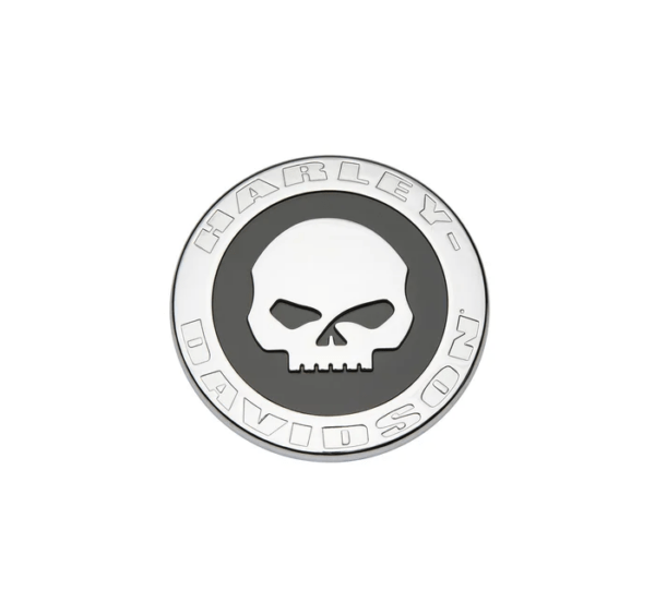 Display a touch of attitude with the Willie G Skull Decorative Medallion. Ideal for application on a plate-style sissy bar upright, derby cover, timer cover, Tour-Pak™ luggage carrier or saddlebag, glove box or chrome battery cover. Also looks great on a tool box or tailgate. The quality adhesive backing on this premium zinc die cast medallion allows for easy and secure installation on most flat surfaces.