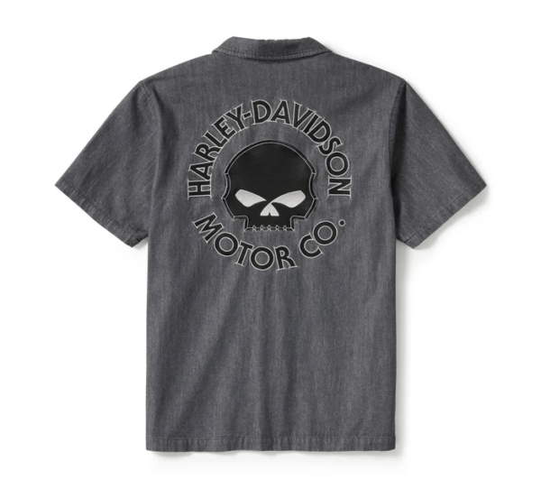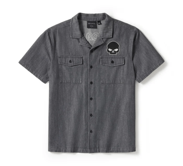 Comfort shares a lane with iconic artistry in the Willie G™ Skull Denim Shirt. It’s crafted from heavyweight cotton slub twill that’s stone washed for a textured, well-worn look (zoom in to see). This men’s short sleeve button down delivers a roomier, mechanic shirt fit and is boldly finished with fearless Willie G Skull graphics. Know the history—though the Skull is one of his most popular creations, iconic stylist Willie G. Davidson also designed several motorcycles, including the 1971 FX Super Glide® and the 1977 FXS Low Rider®.