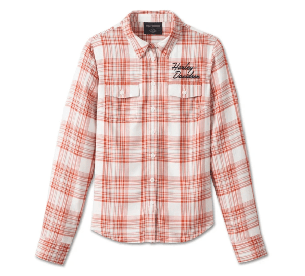 Were keeping your love for one of our best-selling fabrics alive with this Classic Bar & Shield Plaid Shirt. Its 100% viscose twill plaid build is washed for softness, breathable, and drapes beautifully. It features a rounded hem to lengthen your leg line, and a hidden snap-down collar to prevent it from flapping while you ride. Finished with vivid colors and branded embroidery for a look thats authentically Harley-Davidson.
