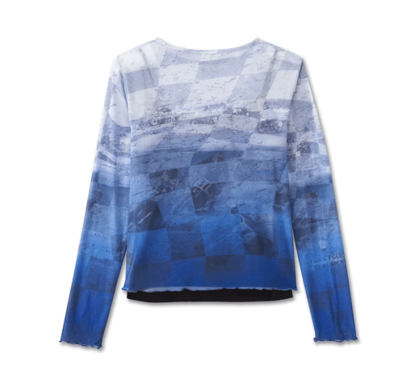 Style synchs with flat track action on our Limited-Edition Cool Blue Mesh Top. This two-piece set includes a fitted camisole with a soft V-neckline, and a long sleeve overlay mesh tee with a crew neckline and lettuce hem. The sheer outer top is crafted from lightweight polyester mesh with a hit of spandex for added stretch. The removable polyester/cotton jersey camisole features adjustable spaghetti straps. This women’s twofer defines standout style with its custom allover pattern that melds a checkered flag with vintage racing shots from our archives. Get this one-of-a-kind look now before supplies run out.