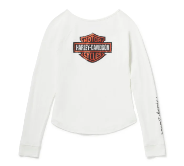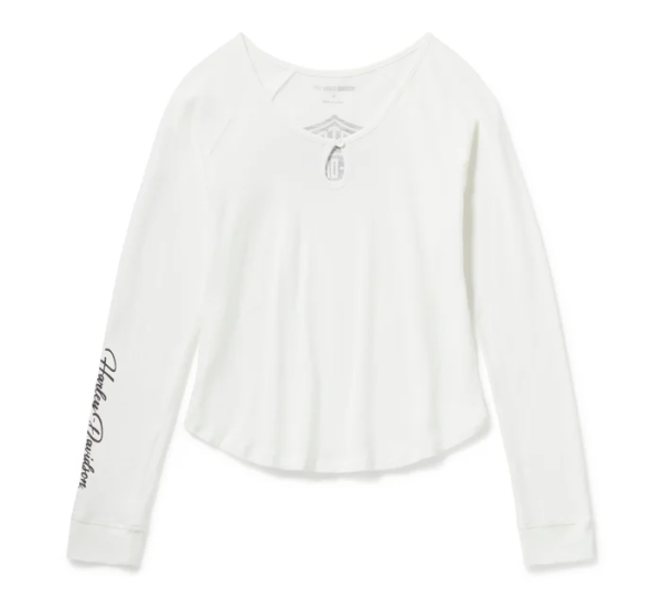 Elevate your casual style with our Essential Bling Keyhole Henley. It’s crafted from super soft cotton slub jersey for a subtle textured appearance. This long sleeve women’s top features a flattering one-button keyhole neckline plus a shirttail hem that visually lengthens the leg line. Rhinestone-embellished graphics ride down one sleeve and are parked on back for a shimmering H-D look.