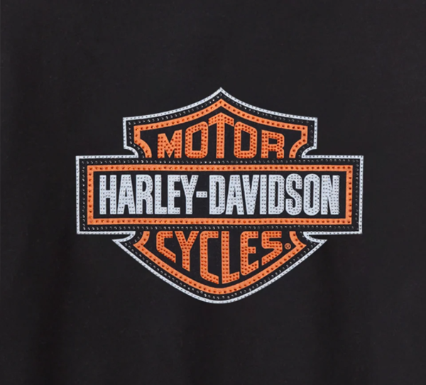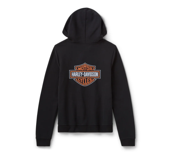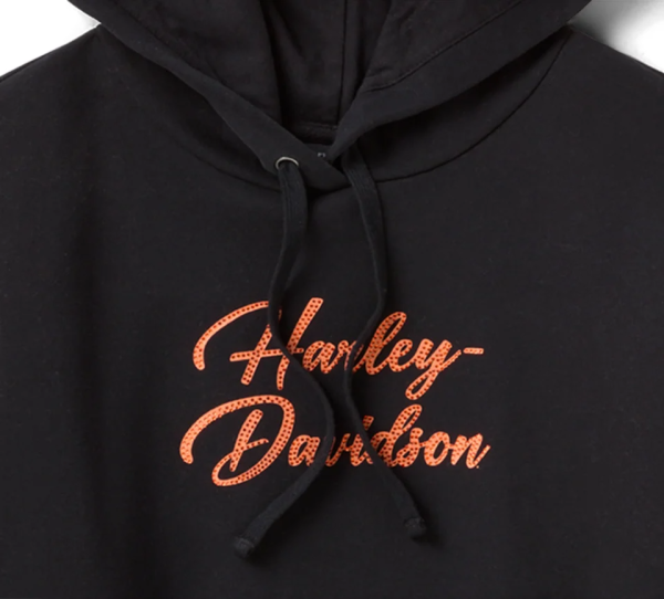 Add some sparkle to your classic Harley look in our Essential Bling Pullover Hoodie. It’s made to keep you cozy from a cotton/polyester fleece in a relaxed fit. This women’s hoodie is boldly finished with rhinestone embellished graphics on both sides.
