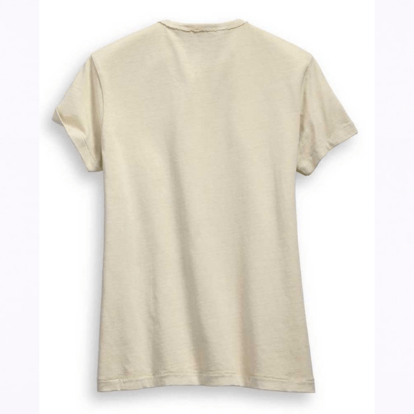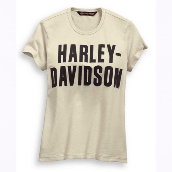 Harley-Davidson® Women’s Jersey Applique Short Sleeve Tee – Bone White, 99276-19VW. Made from 100% cotton jersey. Washed for softness. Garment dyed for faded, vintage look. Raw-edge rib-knit neckline. Laser-cut jersey applique graphics. 99276-19VW