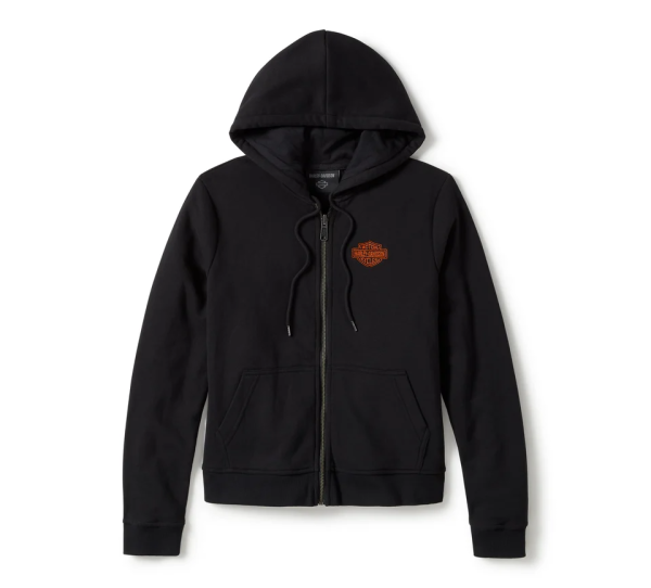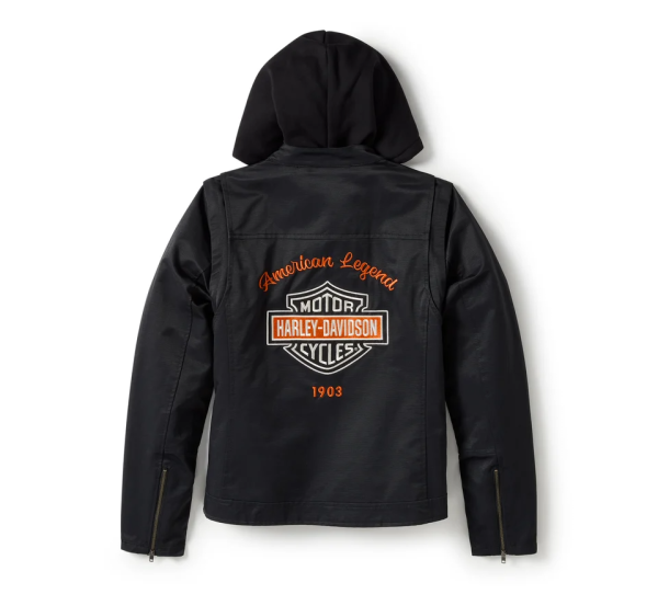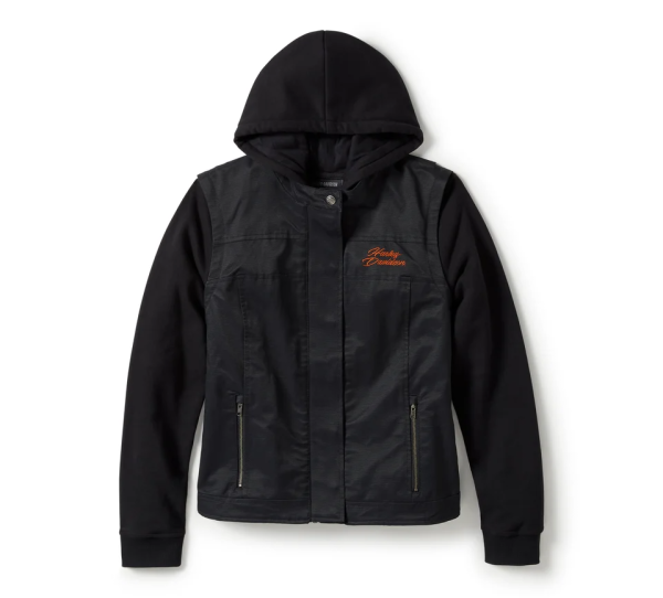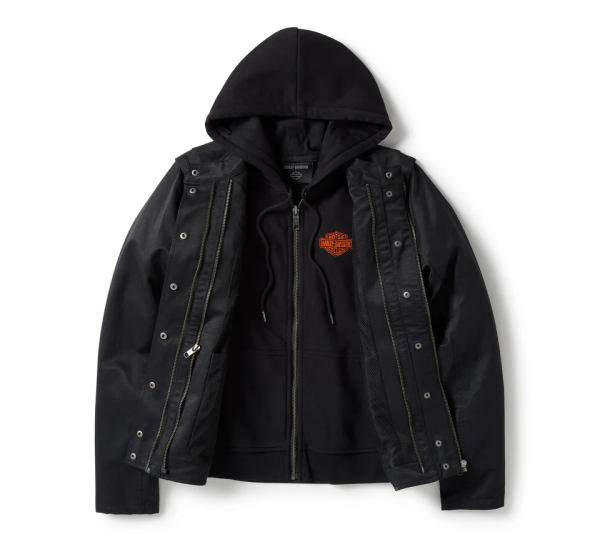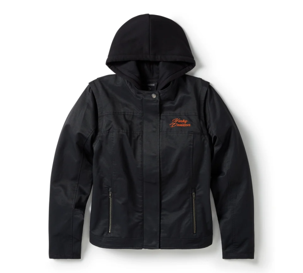 Enhanced style, comfort, and versatility all converge on this latest Miss Enthusiast 3-in-1 Textile Jacket. The outerwear layer is cut from heavyweight cotton/nylon oxford and now features zip-off sleeves to wear as a vest, plus an extended snap-tab collar. We’ve also upgraded the hoodie with an added zipper that secures to the jacket/vest and a drawcord that tucks into the hood so it won’t flap around under your riding gear. Wear the jacket alone, the vest alone, the hoodie alone, or combine them together—either way it’s a must-have for rides, road trips, and rallies. It’s all classically embroidered with our graphics for an iconic Harley-Davidson look. Snag yours now while supplies last.