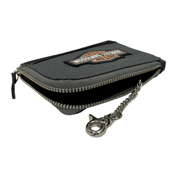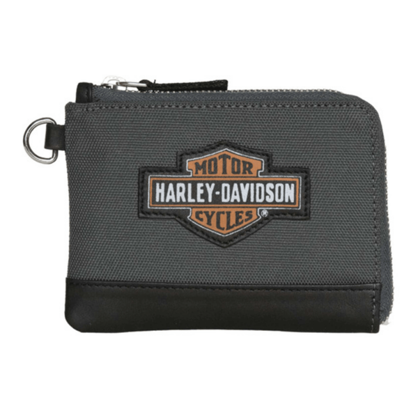 Harley-Davidson® Women’s Oil Can Key Coin Wallet – Gray, HDWWA11765-GRY. Constructed from high-quality polyester with Genuine leather bottom trim. Features a stitched printed Bar & Shield logo patch on front. Polished nickel finish. Interior features slip pocket and gusset pocket. RFID Protection, blocks hackers from reading your information. Size: 4.75″ x 2.75″. HDWWA11765-GRY